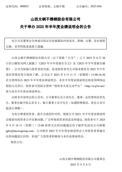 (來源:山西太鋼不銹鋼股份有限公司關(guān)于舉辦2025年半年度業(yè)績說明會的公告)