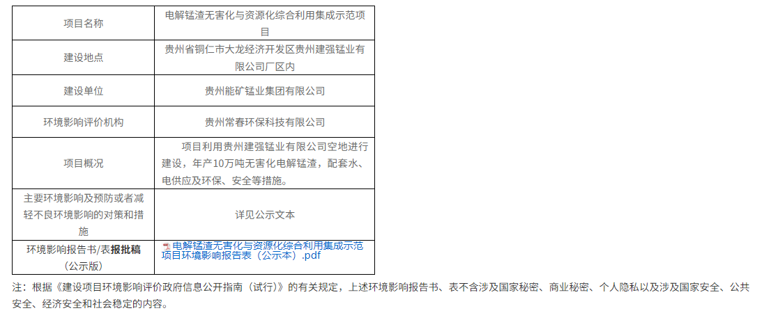 根據(jù)公示內(nèi)容:該項目利用貴州建強(qiáng)錳業(yè)有限公司空地進(jìn)行建設(shè),年產(chǎn)10萬噸無害化電解錳渣,配套水、電供應(yīng)及環(huán)保、安全等措施。