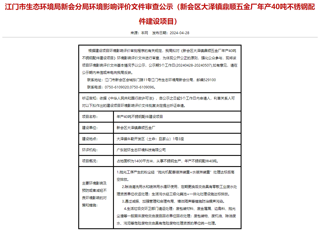 4月28日,江門市生態環境局新會分局就新會區大澤鎮鼎順五金廠年產40噸不銹鋼配件建設項目環境影響評價文件進行審查公示,公示期5個工作日(20240428-20240507)。