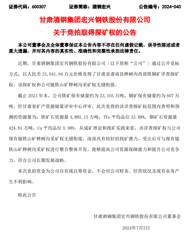 7月5日,據酒鋼宏興公告稱,公司近期通過公開競標方式,以人民幣 33,041.94 萬元價格競得了甘肅省肅南縣樺樹溝西部鐵銅礦詳查探礦權。